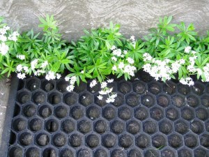 Here is some Galium odoratum, which doesn’t sound nearly as sweet as sweet woodruff, hugging the side door boot mat, and doing double duty camouflaging the a/c hose.