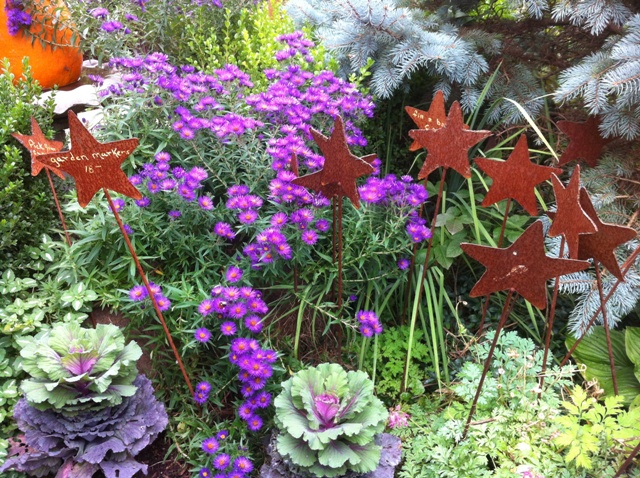 Meanwhile, back at the herb farm in Battle Creek, Michigan. I took this colorfest on October 1st when I was having a wee visit with Michigander Sister. The garden markers made me laugh. They look like they’re having a meeting. The one on the left is saying, Pick Me! Pick Me!