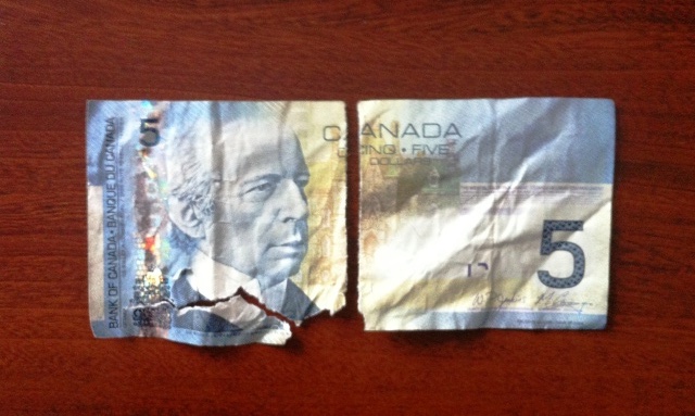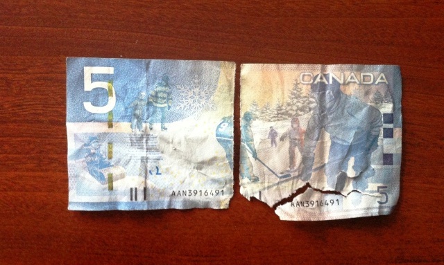 One torn, wrinkled Canadian Five Dollar Bill for a Snickers bar.