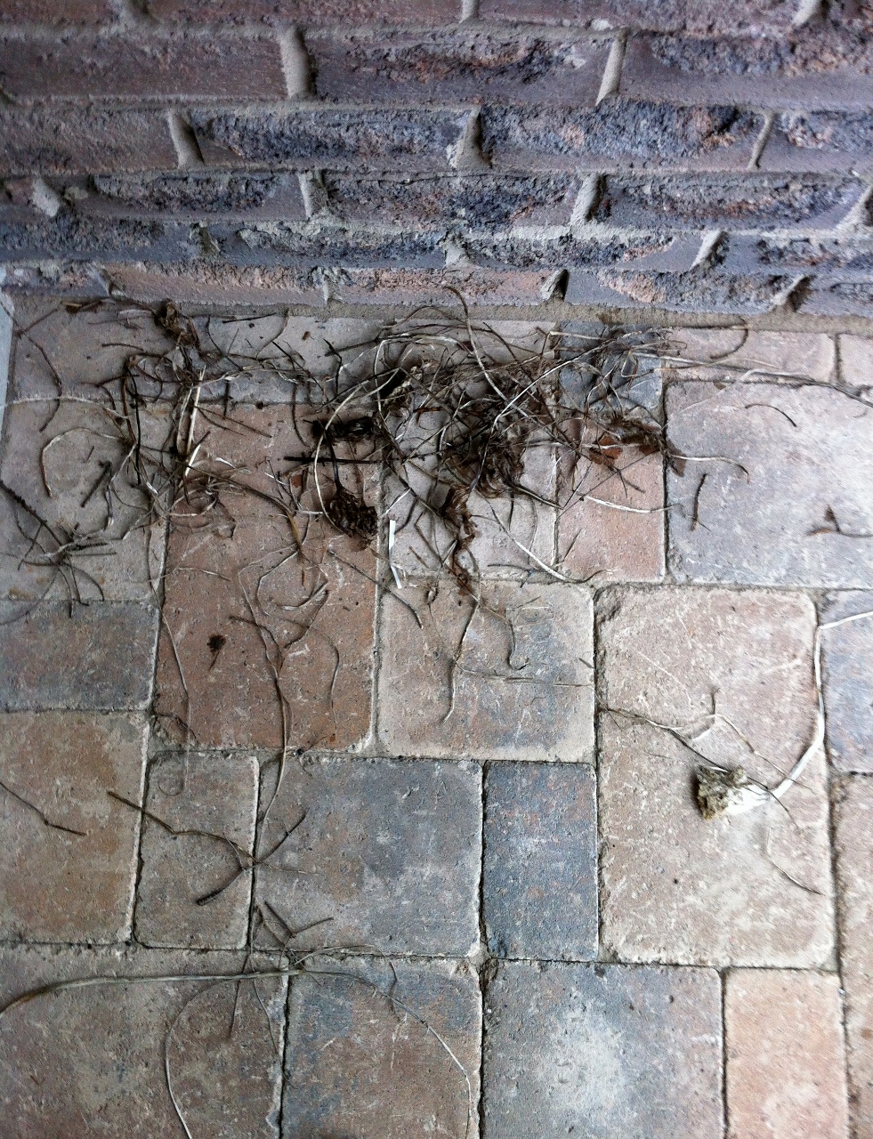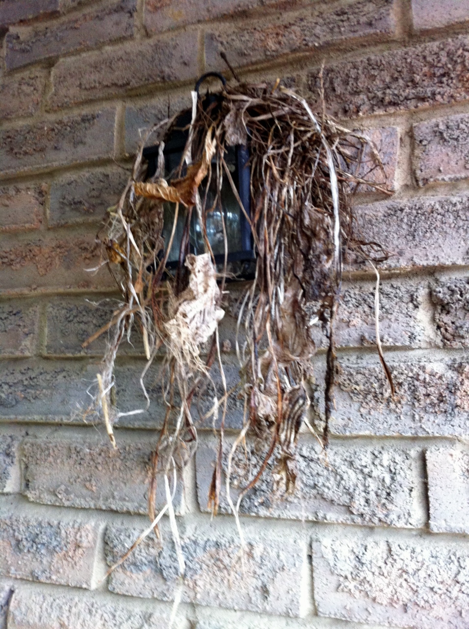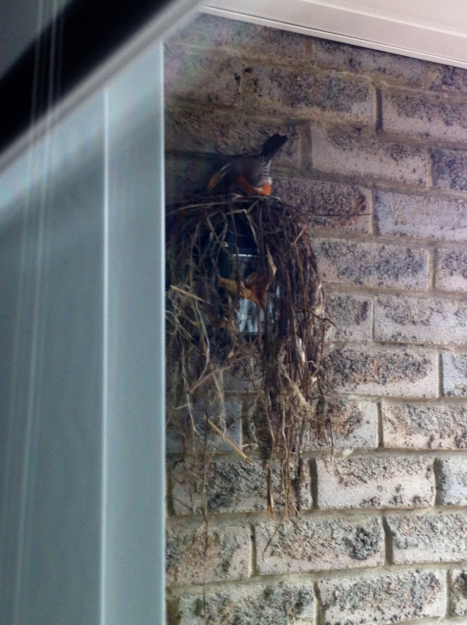 I’m thinking this robin is one straw short of a full nest. This is a very narrow porch. I skulked in the front hall to get these shots of the builder. I had to take them through the glass, so they aren’t as sharp as I would like them to be.