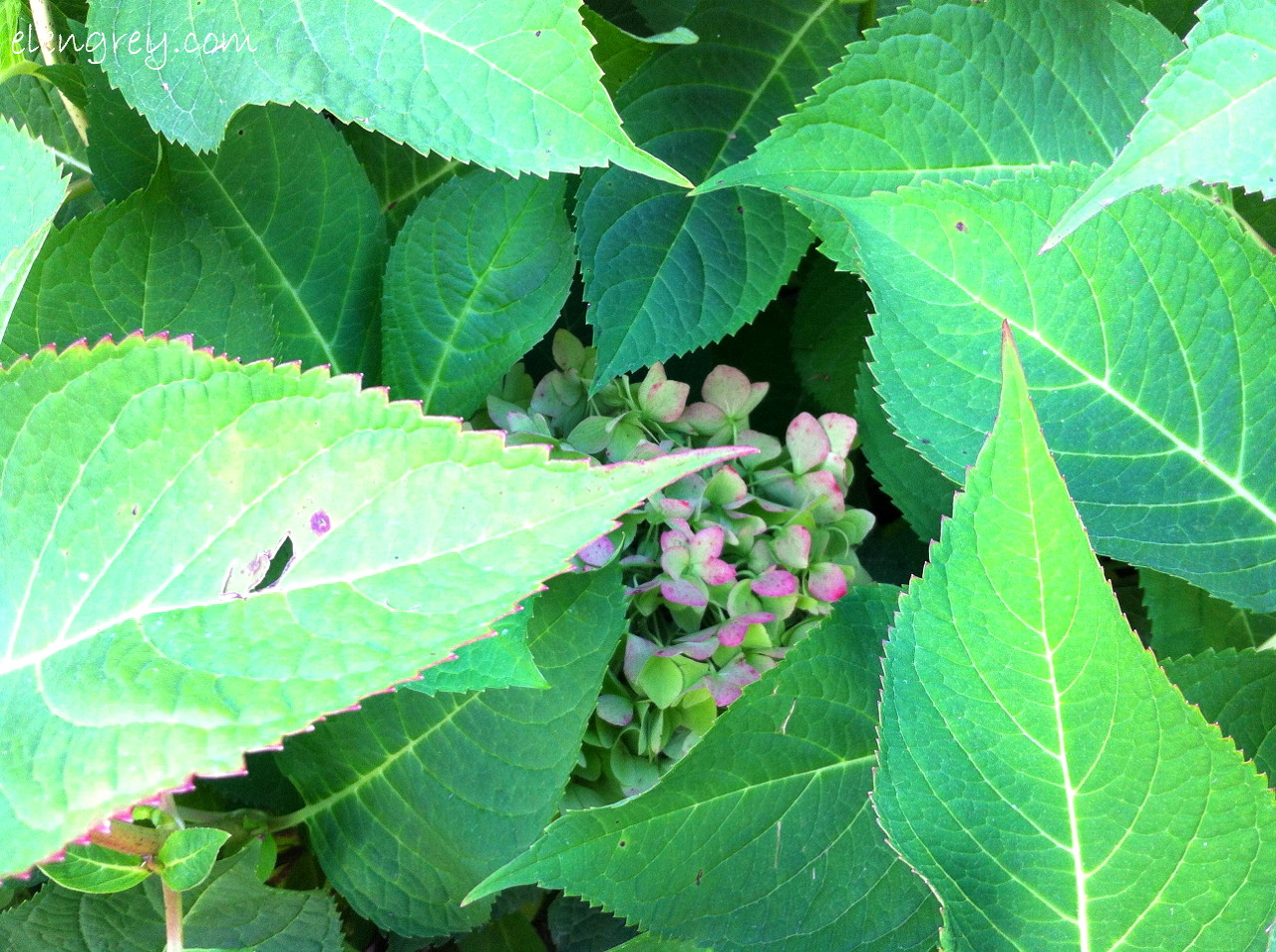 This plant had blooms in three stages. Some were pink, some blue, and this. Just emerging. Just turning.