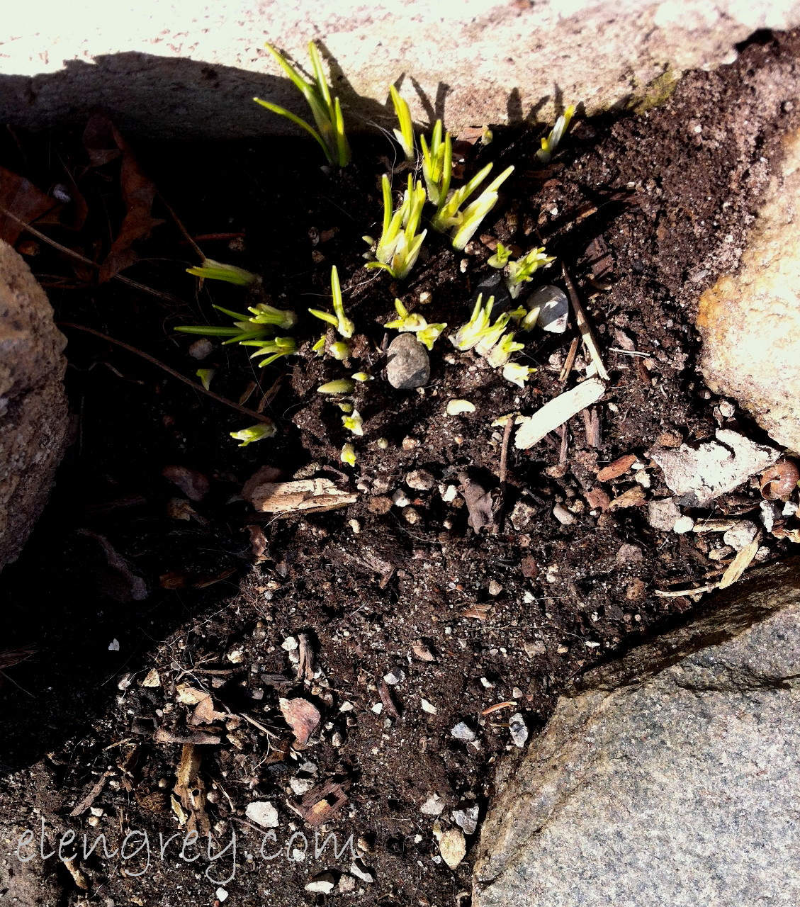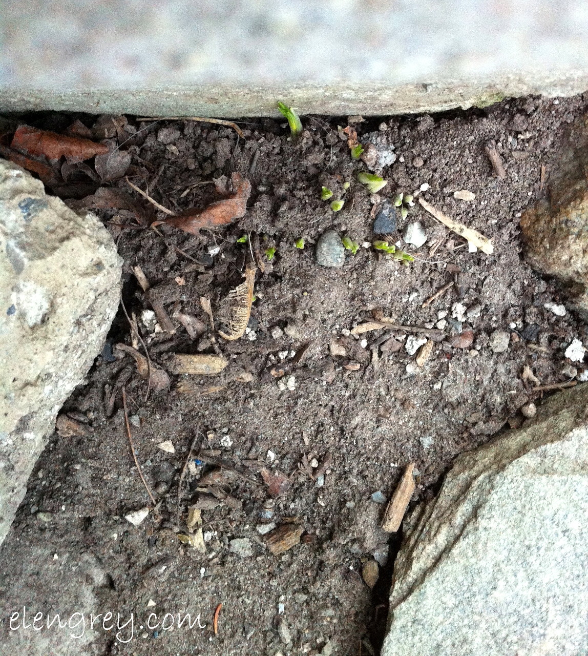Their first appearance at the back corner of the house, where the ground begins to slope down. They are my beacon of hope. I don’t know how they manage to poke their little tips through the winter/spring frozen tundra that we call soil in my neck of Canadaland.