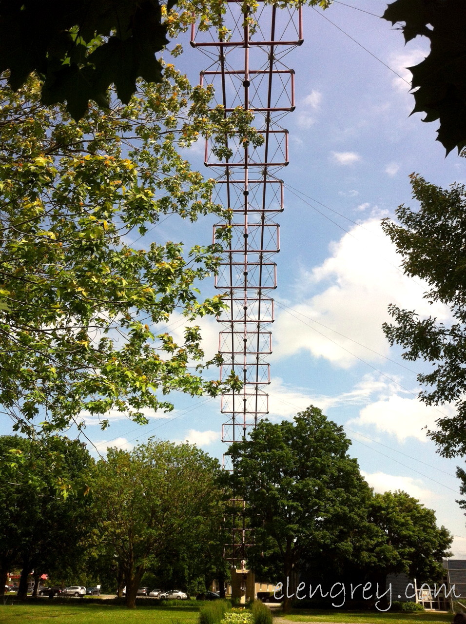 We drank coffee at Brûlerie Mondor, walked centre-ville (downtown), visited the farmer’s market and EXPRESSION, Centre d’exposition de Saint-Hyacinthe on the second floor, where we saw the Jean-Pierre Aubé SATELLITES exhibit. We ate fish and seafood and spinach soup, visited shops, replaced my umbrella, which had snapped in the wind (the first casualty of the roadmance), stopped into the Centre des arts Juliette-Lassonde, walked along the Yamaska River and toured the Cathédrale Saint-Hyacinthe Le Confesseur, and tried to make sense of l’Espace maskoutain — “an enrichment of the Park of the Patriots by the addition of significant elements representing symbolically the forces and strates which compose the Maskoutain reality.” (Translated from the brochure by G-Man. Pardon us, Saint-Hyacinthe, if we did not translate this correctly.) As far as I can tell, Maskoutain or The Maskoutains is a regional county municipality.