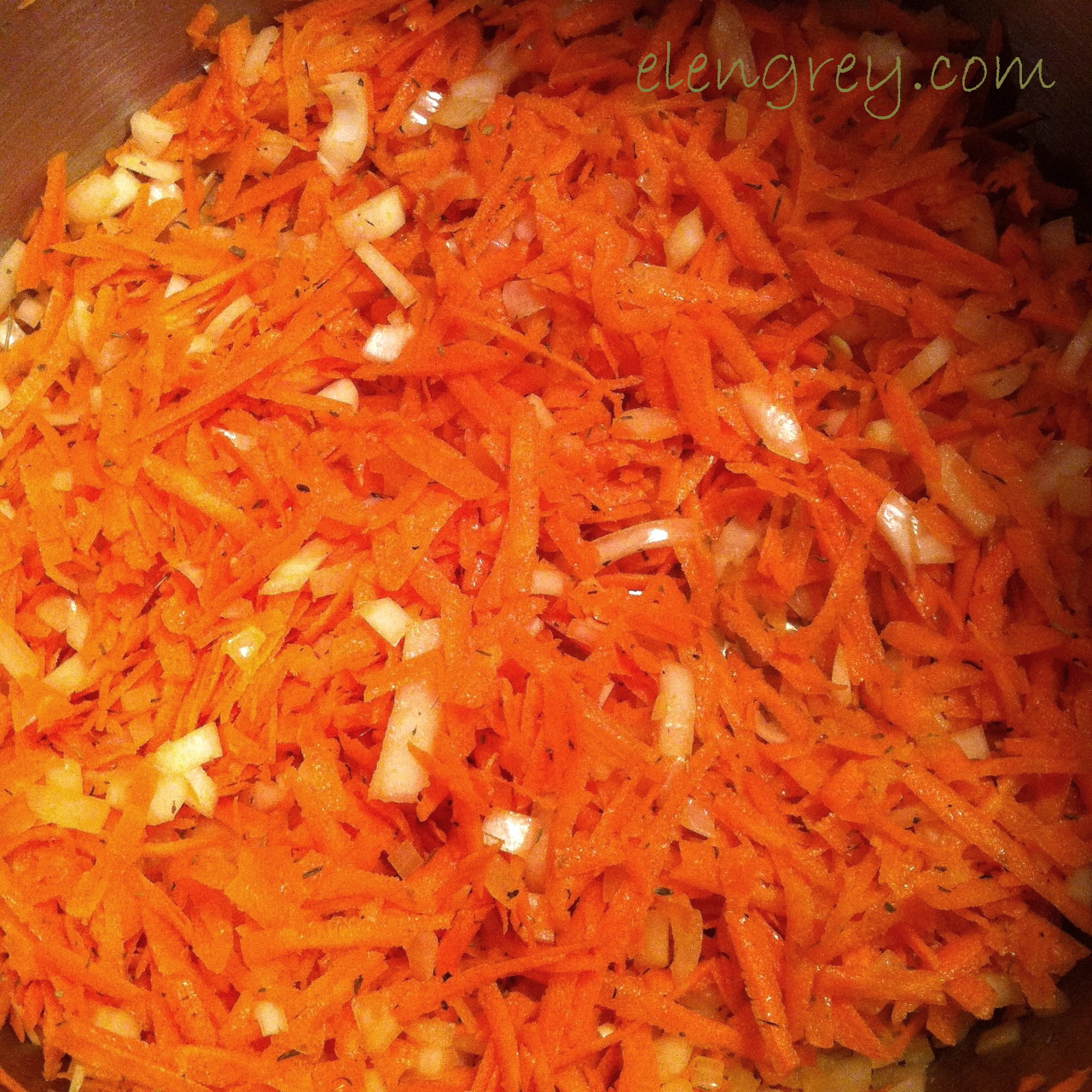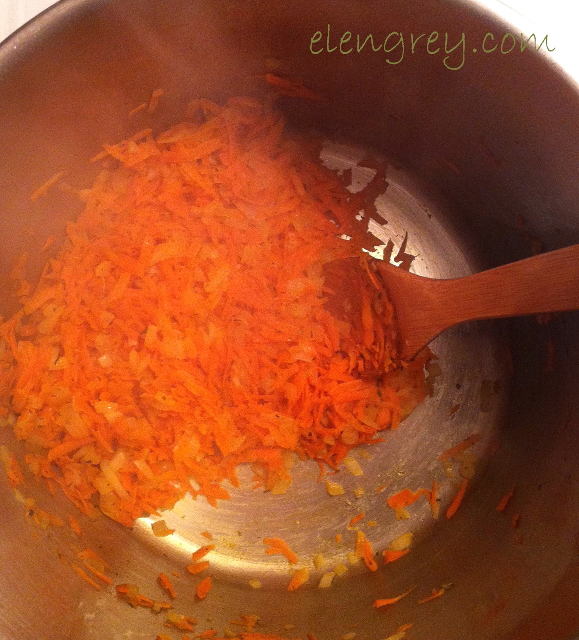 Chop up some onions. Whatever you’ve got. I used cooking onions. Approximately 2 cups. Coarsely grate some carrots. I used three large. I like the carrot. It makes my heart go pitty-pat.