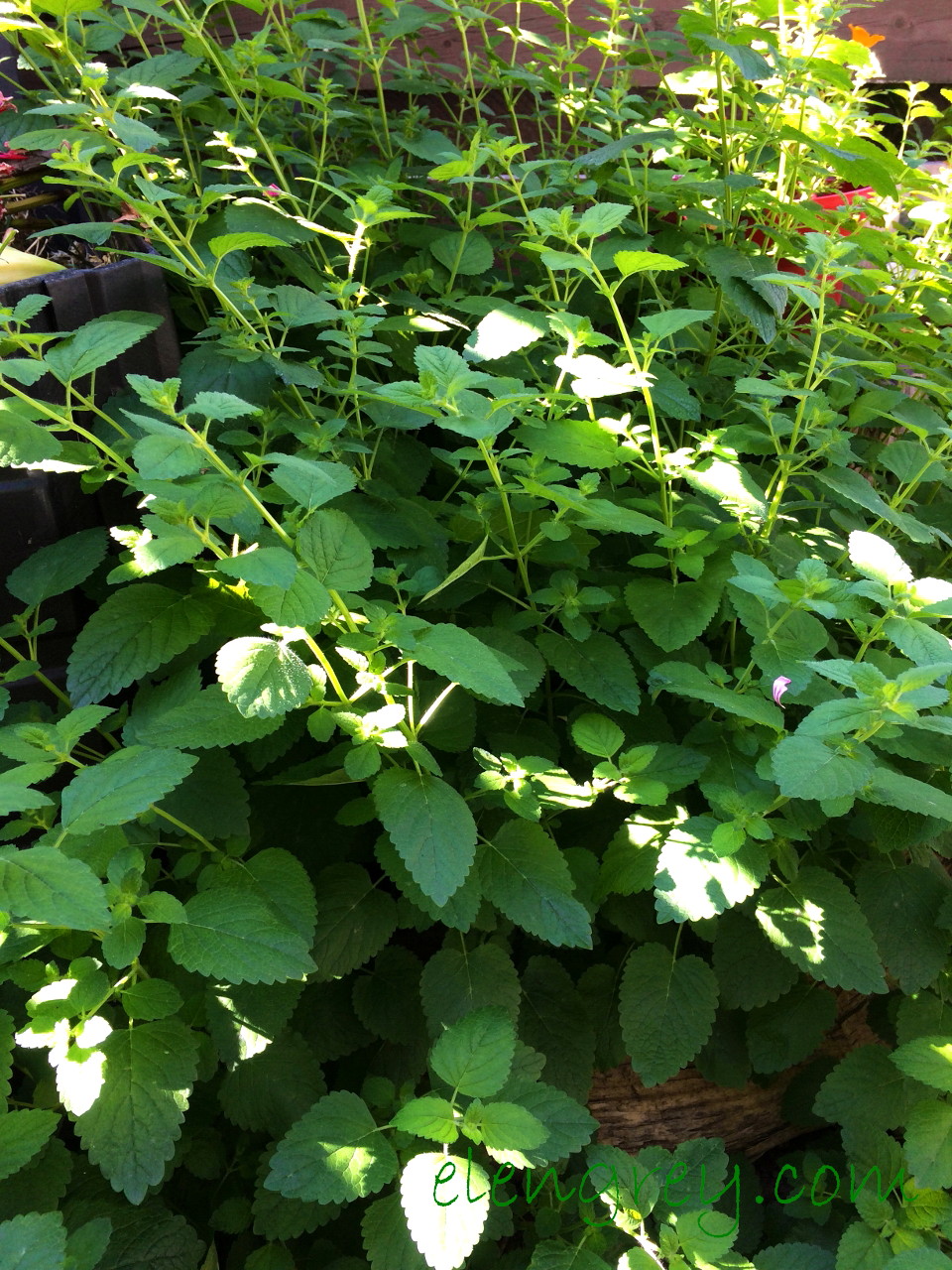 This lemon balm is such a beautiful thing, and this was snapped in the late afternoon light. I see a red pot of bright orange marigolds playing peek-a-boo.