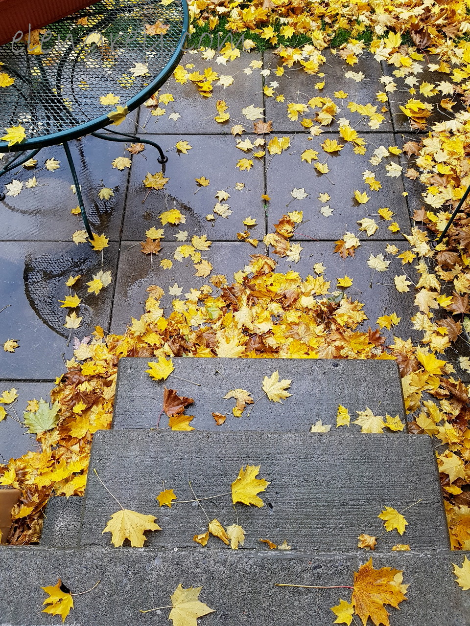 My neighbor has a beautiful maple in his back garden that he planted when his daughter was born. She’s in uni now, which I’m in denial about. Totes. It hangs over our mutual fence like and old friend ready for a good gossip. Each year in November, this tree goddess scatters her bright, golden leaves over my yard like a blessing. Just to the right of these stairs, from the back of the house to the back of the yard, is a thick carpet of leaves. Yet, until three days ago, she still had a full set of leaves on her branches even though my back garden was covered. She is a fecund breed of maple.