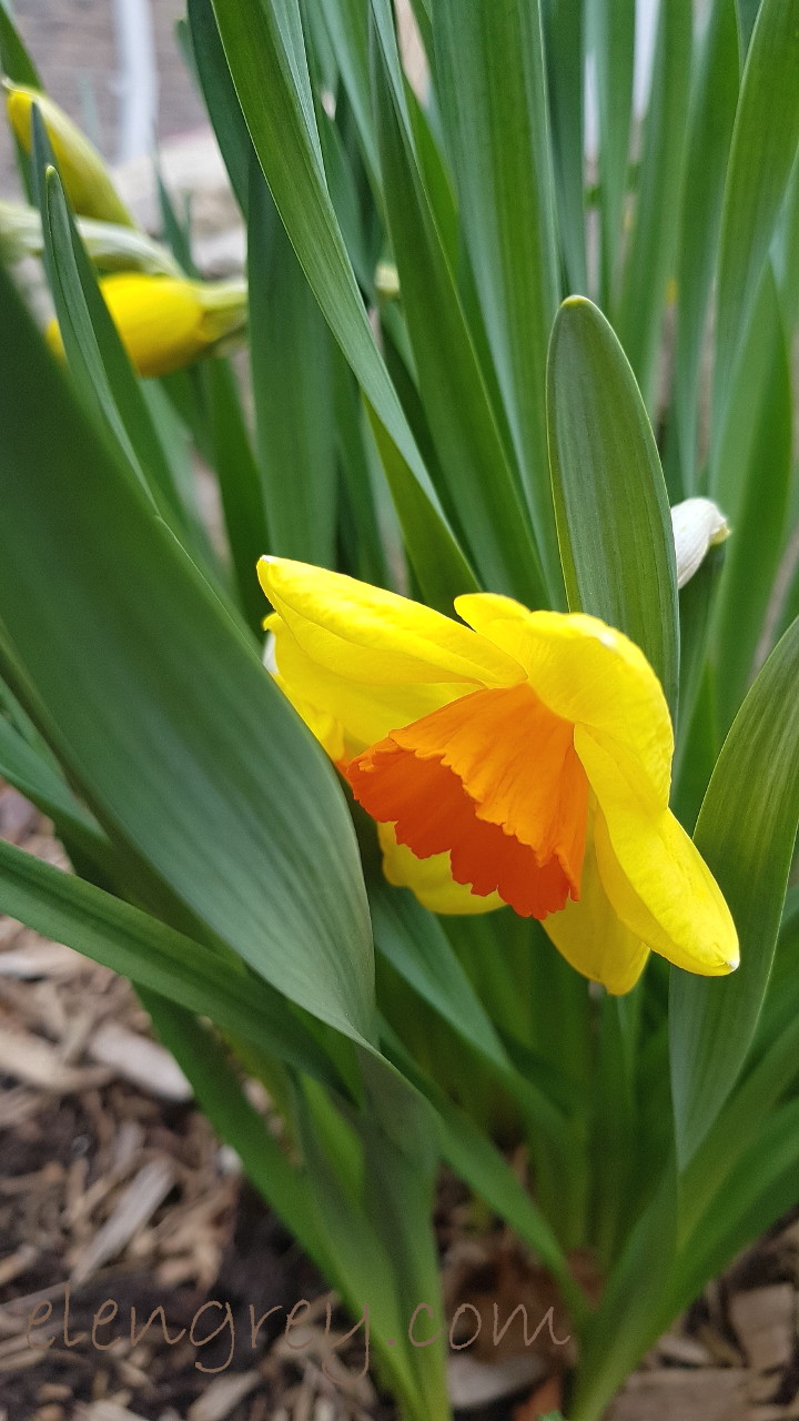 Took this click under my knees while sitting on a one-step step stool in the frontscape tidying up perennials. I was in constant danger of tipping over backwards. So when I say Daffy Girl, I might be referring to myself.